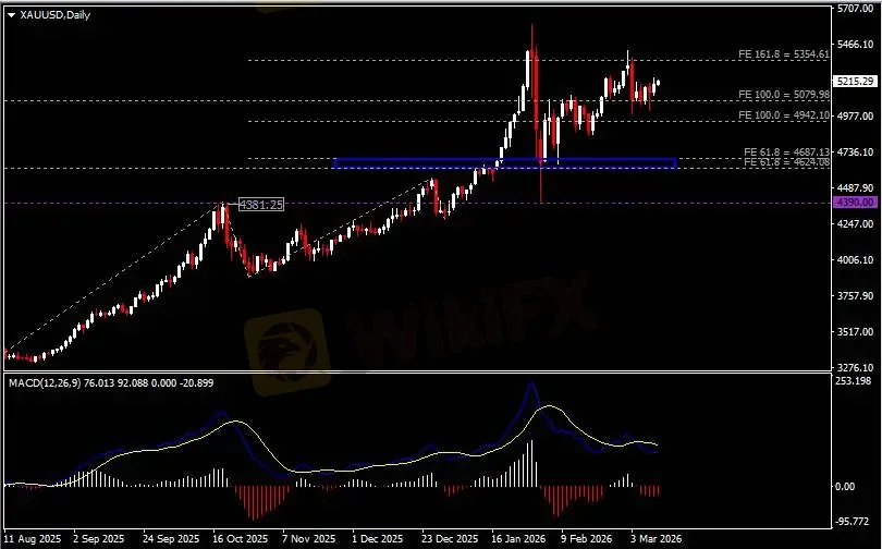 日线图显示金价震荡上行,当前收于5080支撑。从MACD来看,快慢线呈拐向,红色动能柱温和收缩。金价走势基本和动能柱的变化一致。