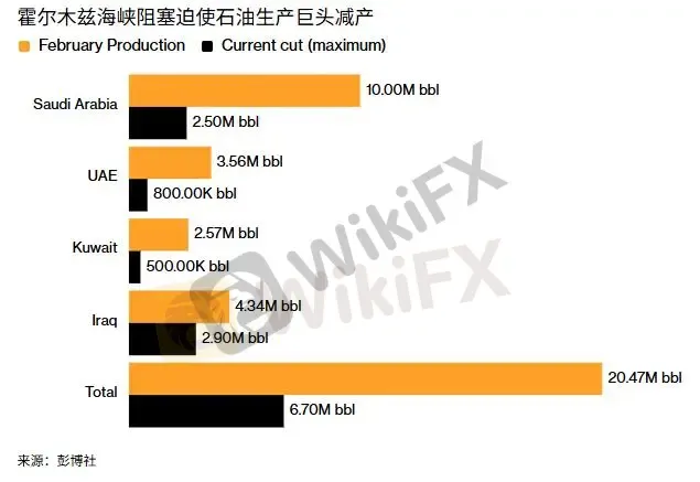 霍尔木兹海峡是全球能源运输的“咽喉要道”,全球约20%的海运原油每天需经过这一狭窄水道。随着美以与伊朗冲突升级,伊朗威胁袭击油轮已导致该海峡航运近乎完全停滞。据彭博社报道,受此影响,主要产油国已大规模减产:合计超过600万桶/日的供应暂时退出市场,相当于全球需求的6%左右。