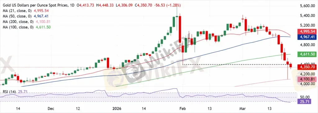 由于该金属跌破了 $5,000 附近的 21 日均线和 $4,970 附近的 50 日均线,打破了之前的短期支撑带,因此近期倾向转为看跌。现在,价格向 $4,610 附近的 100 日均线靠拢,凸显出从之前受到支撑的上升趋势向修正阶段的过渡。14 天 RSI 为 26,显示超卖状态,但从 50 以上持续下跌,凸显出卖压占主导地位,而非完成下行。