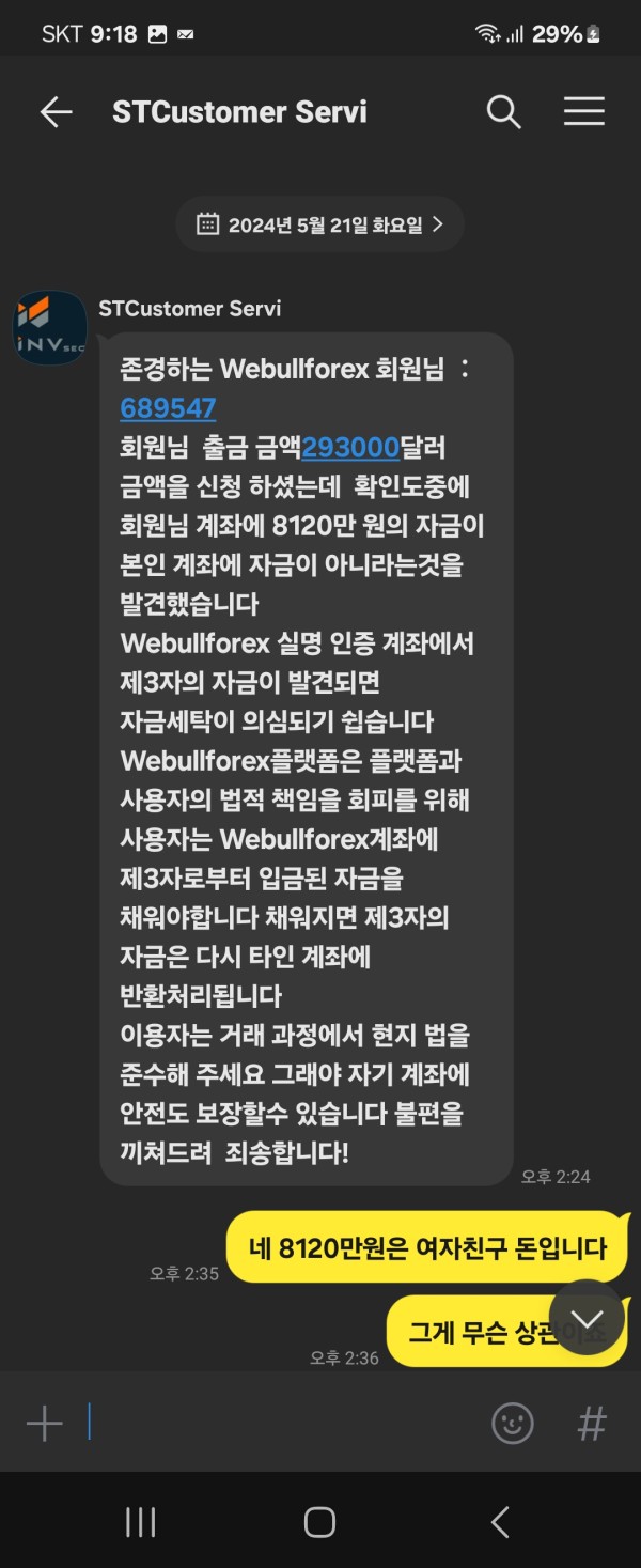 안녕하세요. 웨블포랙스 회원입니다. user401346 회원 입니다. 저는 293000달러 환전 신청을 하였습니다. 고객센터에서 수수료 39683627원을 붙치라고해서 붙첬습니다. 그런데 제 삼자의 자금이 확인되었다고 환전 불가능이라 합니다. 제가 친구돈 8120만원 빌려서 달려 구입하였습니다. 그돈 때문에 환전 못해준다고해서 해결책을 물어보았습니다. 고객센터에서 8120만원을 입금해야 293000달러.환전 해준다고 합니다. 그래서 제가 돈이 여유가 없다고 했습니다. 고객센터에서 그럼 8120만원에 반을 입금하면 293000달러 환전 해준다고 했습니다. 그래서 제가 4천만원 입금시켰습니다. 또다시 고객센터에서 환전을 못해준다고합니다 무엇때문에 안되는지 물었습니다. 신용이 뜰어져서 안댄다고 합니다 .또다시 고객센터 친구돈 나머지 4120만을 붙처야 293000달러 환전 가능하다고합니다. 그래서 2천만원 붙치고 나머지돈은 없다고해서 친구한테 보증을 쓰면 해준다고 합니다 친구 보증 쓰고 또 환전을 못해준다고 합니다 신용 점수가 낮아서 못해준다고합니다. 그래서 시간이 20 일이 지났습니다. 고객센터에서 동결 되었다고 합니다. 동결 풀려면 1천만원을 붙처야 한다고합니다 그래서 또 1천만원을 붙첬습니다. 신용 점수 올려야 환전 가능하다고해서 신용점수 올리는데 1천만원 붙첬습니다 토다시 고객센터에서 1150만원을 요구해서 붙첬습니다. 그리고는 고객센터 열락이 안댑니다