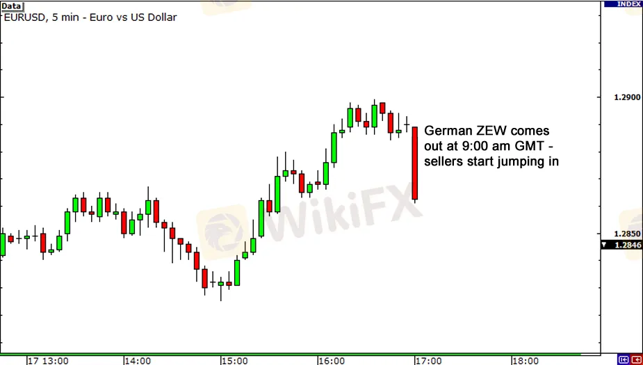 讓我們看一下圖表,看交易商如何利用這些訣竅來發揮他們的優勢。下面是歐元/美元的5分鐘圖表。在這裡我們看到,剛剛發布的德國ZEW經濟景氣指數,這是一個影響力很大的數據報告。散戶交易者正在看他們的圖表,看到歐元/美元正在下跌,所以他們決定出手了。