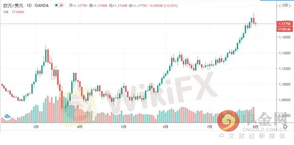 週一(8月3日)亞洲時段,美元指數小幅震盪下跌,現交投於93.47一線。歐元兌美元震盪上漲,現交投於1.1776一線。