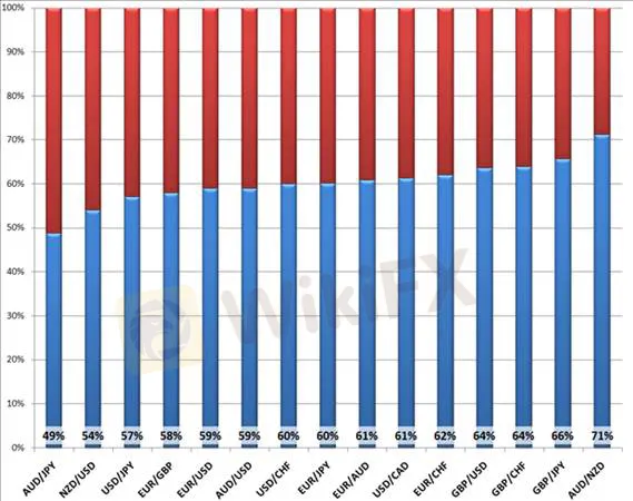 下圖是我們根據實際帳戶總結的交易者在主要貨幣對上的交易勝率(紅色代表虧損離場,即失敗;藍色代表獲利離場,即勝利):