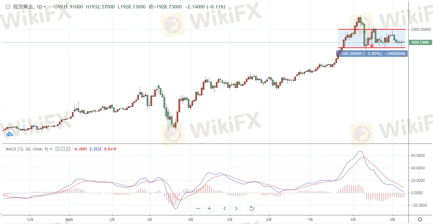 黃金方面,週三(9月9日)亞市早盤,現貨黃金延續近期的弱勢調整之勢,基本持平,但是仍位於1930關口下方運行,暫報1928.71美元/盎司。雖然市場避險情緒回升,但是資金卻湧入美元,致使黃金仍止步於1930關口下方。