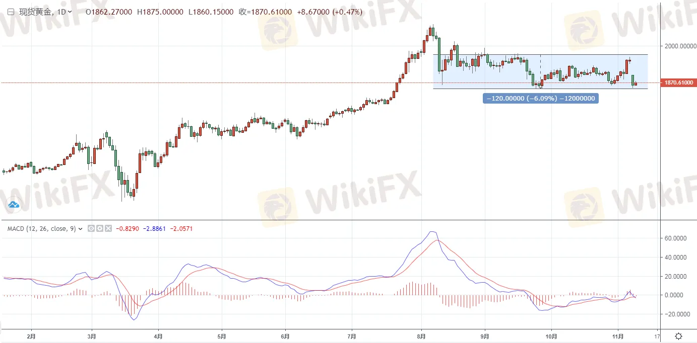 摘要:黃金方面,週二(11月10日)亞市早盤經過昨日的暴跌後今天有所反彈,退守1870關口,暫報1870.66美元/盎司。在美國大選結果基本落地以及隔夜輝瑞表示其實驗性疫苗對預防新冠病毒的有效性超過90%之後,市場風險偏好大幅飆升,避險資產黃金一瀉千里,昨天一度下殺至1850關口。