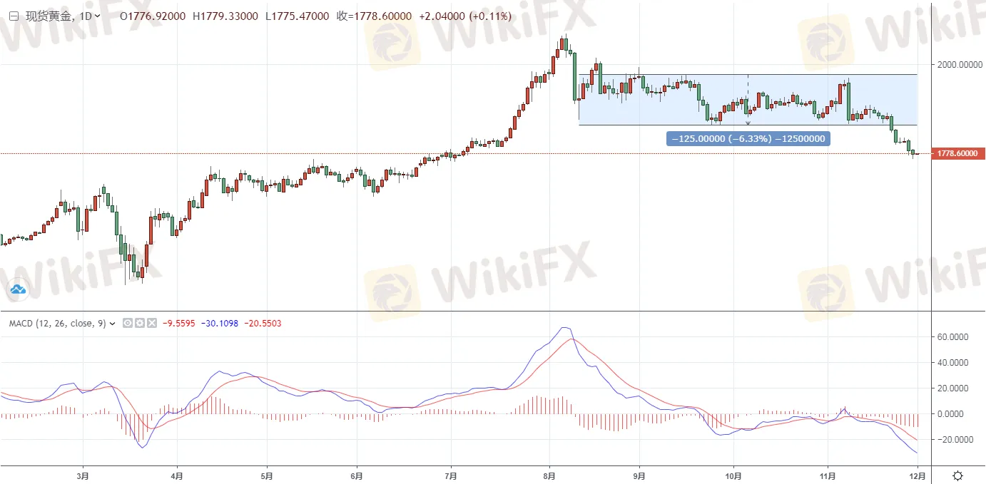 現貨黃金昨日收報1776.70美元/盎司,下跌9.43美元或0.53%,盤中最高觸及1789.85美元/盎司,盤中觸及月2日以來的最低水準1764.34美元/盎司。11月份累計下跌102.23美元或5.44%,為連續第四個月走低。上周,現貨黃金下跌84.71美元,跌幅達4.53%。今天現貨黃金微幅走高,但仍居1780關口下方運行,暫報1782.46美元/盎司。從近期的表現看,金價整體呈現出高位回落的格局,從趨勢看,金價反彈高點不斷被壓低,由於市場對於目前已知的風險已經麻木,致使黃金連續承壓回落。隨著疫苗的利好頻出,市場的風險情緒大受鼓舞避險資產黃金則遭冷落,慘遭拋售持續下挫,徹底失守1780關口。從圖中不難發現,在跌破1850-1975區間後,金價開啟單邊暴跌模式,從目前看,下方的MACD指標顯示做空動能仍在逐步增強,短線仍是空頭行情,雖日內微幅走高,但不可盲目抄底。(僅供參考)