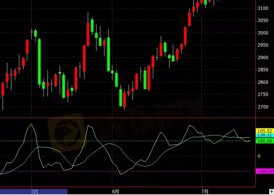 CCI指標的背離是指CCI指標曲線的走勢和股價K線圖的走勢方向正好相反。CCI指標的背離分為頂背離和底背離兩種。當CCI曲線處於遠離100線的高位,但它在創出近期新高後,CCI曲線反而形成一峰比一峰低的走勢,而此時K線圖上的股價卻再次創出新高,形成一峰比一峰高的走勢,這就是頂背離。