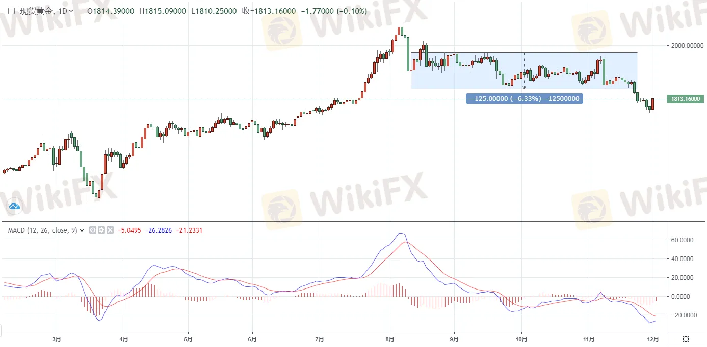 黃金方面,週三(12月2日)亞市早盤現貨黃金經過昨日的暴力反彈之後,日內暫維持窄幅震盪,持穩於1810關口之上,目前暫位於1813.15美元/盎司附近整理交投。由於市場預期美國將出臺更多刺 激措施,美元下跌,避險資金湧入黃金,金價超跌反彈。