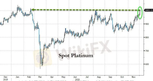 行情數據顯示,現貨鉑金隔夜自8月以來首次站上1000美元/盎司,在12月取得開門紅。