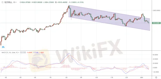 3.美國商務部週五公佈,12月份零售額下降了0.7%,為連續第三個月下降。經濟數據顯示新冠肺炎疫情對經濟的持續影響提振了對避險貨幣的需求,美元兌一籃子貨幣週五全線上漲,觸及近四周高點。美元上漲令以美元計價的黃金承壓。
