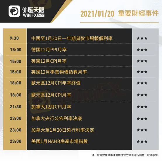以下為1月20日(周三)重要財經事件,更多資訊,請關注外匯天眼APP或官方網站!
