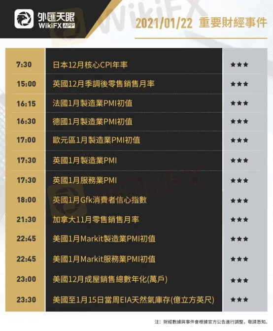 以下為1月22日(周五)重要財經事件,更多資訊,請關注外匯天眼APP或官方網站!