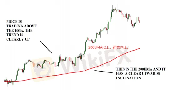 判定趨勢我們僅僅使用一根指數均線200EMA,價格高於200EMA,即趨勢向上,價格低於200EMA,即趨勢向下。如圖: