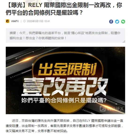 去年5月份,外匯天眼就曾曝光RELY 爾萊國際 出金限制一改再改,讓投資者人忍無可忍!