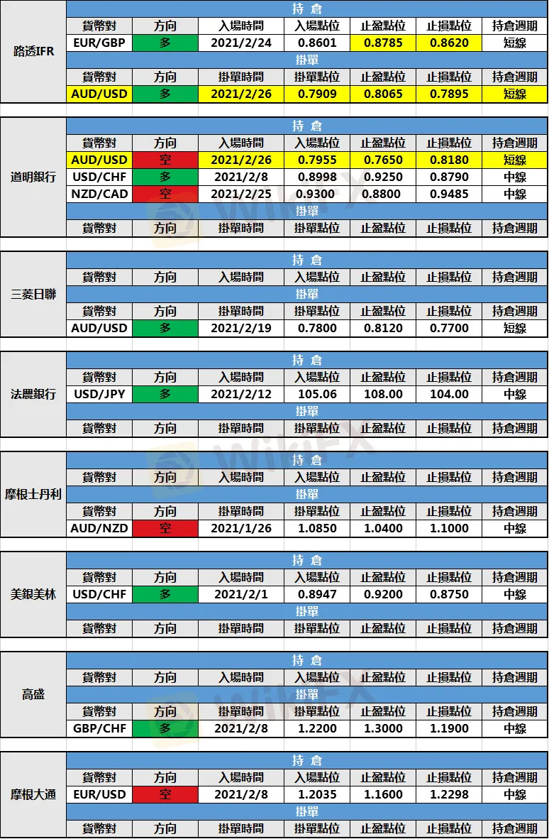 (1)道明銀行新增澳元/美元空頭持倉,入場點位0.7955,止盈點位0.7650,止損點位0.8180。