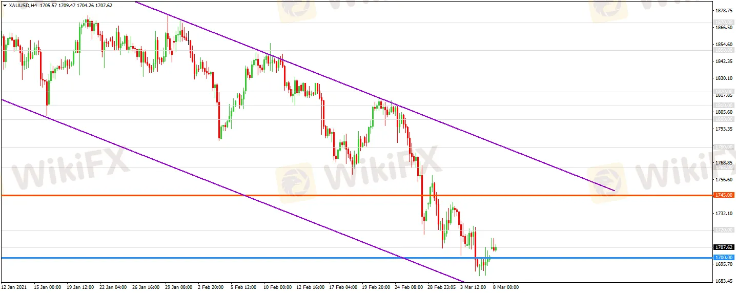 金價上周大跌,盤中破位1700美元/盎司,上周為連續第三周下跌。從技術面上4小時級別圖表上看,金價處於下降通道內,短期1小時逐級震盪走跌,目前觸及1700美元水準及下降通道底部疊加的雙重支撐,日內或進一步延續反彈態勢。