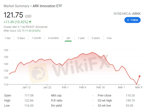 Cathie Wood旗下的旗艦基金ARKK 3月9日週二大幅上漲10%,創下2014年上市以來的最大漲幅,今年以來的累計跌幅收窄至2%。其中,當日重倉股特斯拉上漲近20%,創去年2月以來最大漲幅。