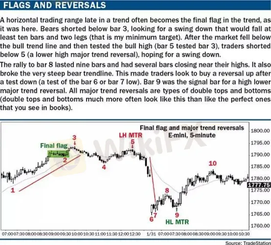 也就是說,大多數反轉形態包含一個交易區間,通常是末端旗形反轉,或是主要趨勢反轉。大多數頂部反轉通常是小旗形末端反轉的變形體,此後,通常形成主要趨勢反轉。比如說,市場在頂部下探後,通常會向上考驗前期高點,再形成一個相對較低的高點,構成主要趨勢反轉,而隨後第二次下探的幅度將至少與第一次相同(見下圖“Flags and reversals”)。