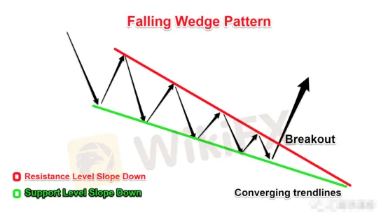 下跌楔形模式背後的心理是,隨著價格區間縮小,買家變得更加積極,而賣家沒有足夠的動力繼續。