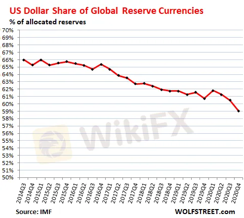 去年疫情爆發後美聯儲加大QE“放水”力度,美元明顯走軟,美元指數全年跌超6%,創三年最大年度跌幅。新近數據顯示,美元作為儲備貨幣的地位也大幅下降。