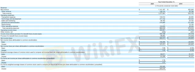 根據招股書的數據,2020年Coinbase實現淨收入11.41億美元,歸屬於普通股股東的攤薄後淨利潤為1.274億美元,折合每股1.40美元。