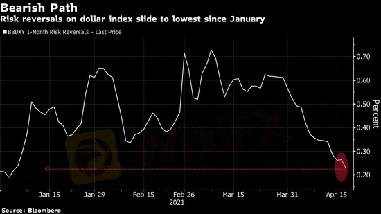 彭博美元即期指數1個月風險逆轉在週一觸及1月初以來最低,預示美元面臨更多下行風險。這項反映美元需求的指標正在朝年內低點邁進。若跌破這道關位,可能進一步走弱。