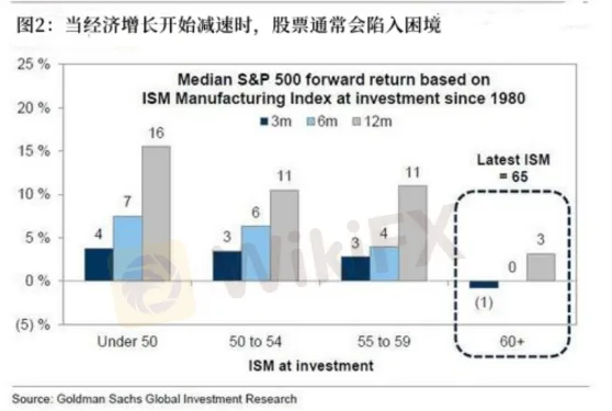 這位高盛策略師借鑒了邁克爾•威爾遜(Michael Wilson)上周的說法,他寫道,在過去40年裏,當ISM製造業指數超過60時,通常與經濟增長峰值相吻合,購買標普500指數的投資者隨後一個月和一年的平均回報率分別為-1%和3%。