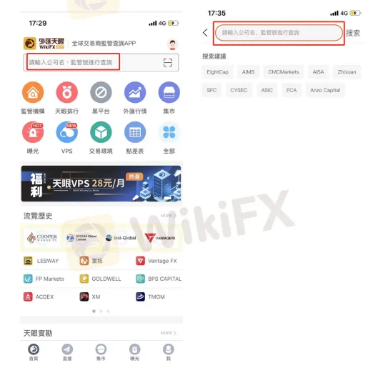 步驟一,打開外匯天眼APP,搜索該交易商名稱。