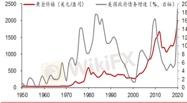 黃金價格走勢與美國政府債務擴張速度(1950年-2020年)
