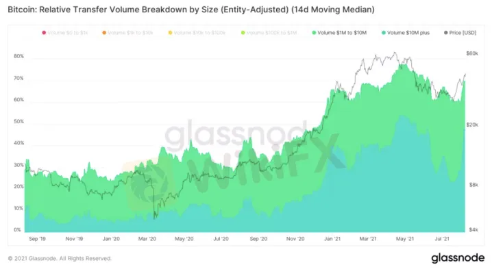 自8月初以來,價值至少100萬美元的比特幣鏈上交易額增長了10%,占總轉移價值的近70%。
