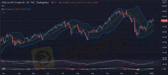 從技術角度來看,WTI油價從去年12月份低位63美元附近反彈至昨日高位78美元之上。RSI在50之上,MACD指標快慢線成金並在0軸之上.保力加通道開口向上,貼近上軌。短期仍可以看漲,上望80美元,支撐位73美元附近。