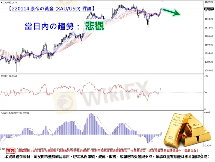 在每30分鐘K線,12條移動平均線,出現糾結,多空不明。雖然RSI在50以上是利多訊號,但是MACD卻短暫突破0軸以上,利多訊號薄弱。此外,從黃金期貨的量價關係,得知價揚、量縮的背離訊號。