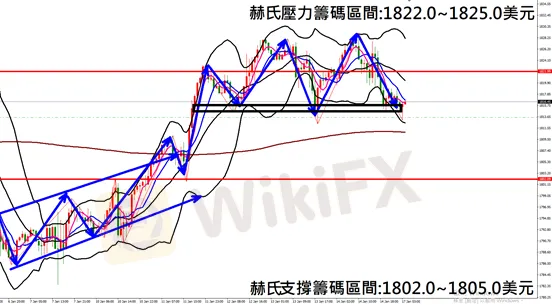 今日黃金(1月17日)早盤在1817.4美元/盎司附近,從技術分析面切入1小時級別觀察走勢架構上週五(14日)K棒出現拉回修正走勢,目前反彈上漲,目前K棒落在中軌附近震盪,同時布林通道呈現縮口,如有跌破下方支撐頸線,因此建議佈局空單為主。