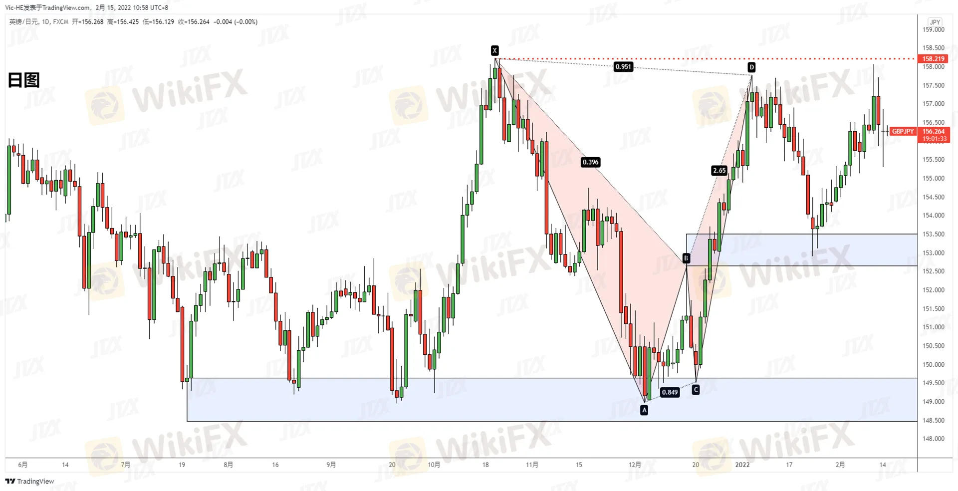 GBPJPY日線到位前高後出現回落,短期行情關注155一線支撐區域。行情下破將去向前期153-153.5支撐區域,短線反抽不過可短空操作。
