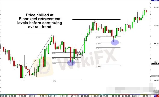 在大多數情況下,價格回調在繼續整體趨勢之前徘徊在38.2%、50.0%和61.8%的斐波那契回調水準。 如果價格超過這些水準,這可能是反轉正在發生的信號。