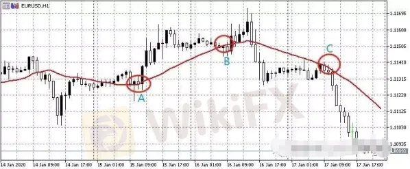 如上圖所示,在A點附近,MA與K線貼近,A到B段,K線位於MA之上,市場價格小段上升;因為這期間明顯受陰線(黑色線條)影響較大,所以很快,MA與K線又在B點相交,B到C段,部分K線在MA上方,部分在下方,此段為行情調整期;在C點之後,K線位於MA下方,市場價格呈下跌趨勢。