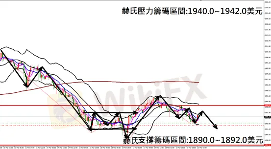 今日黃金(3月21日)早盤在1920.0美元/盎司附近,從技術分析面切入1小時級別觀察走勢架構上周五(18日)K棒高點震盪後持續下跌走勢,目前K棒轉為空方排列走勢,同時布林通道開口轉折朝下,因此建議布局空單為主。