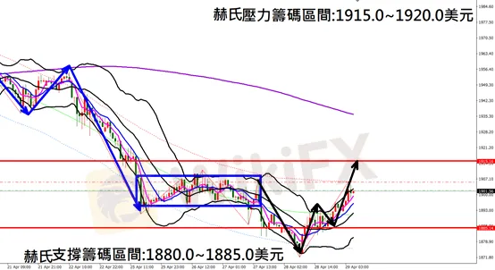 今日黃金(4月29日) 早盤在1893.6附近,從技術分析面切入,1小時級別觀察走勢架構昨日(28日)K棒落在低點狹幅震盪,隨後反彈上漲,目前K棒呈現多方排列,同時布林通道開口轉折朝上擴張,因此建議佈局多單為主。