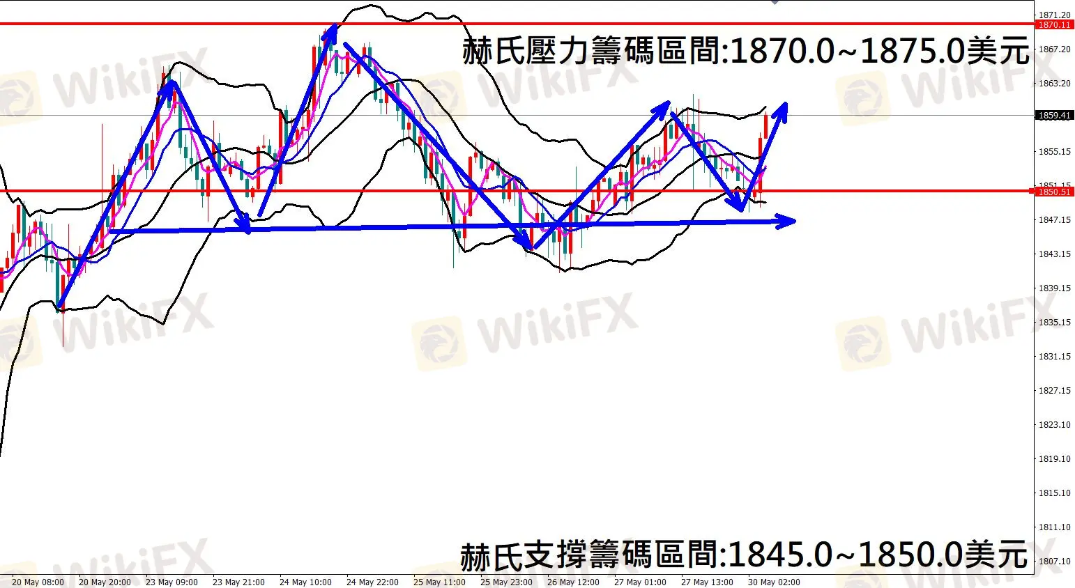 今日黃金(5月30日) 早盤在1850.8附近,從技術分析面切入,1小時級別觀察走勢架構上周五(27日)K棒反彈沒過高點後,拉回下跌,今日早盤出現急漲,目前K棒站在中軌上方,若中軌站穩將再次上漲,因此建議佈局多單為主。
