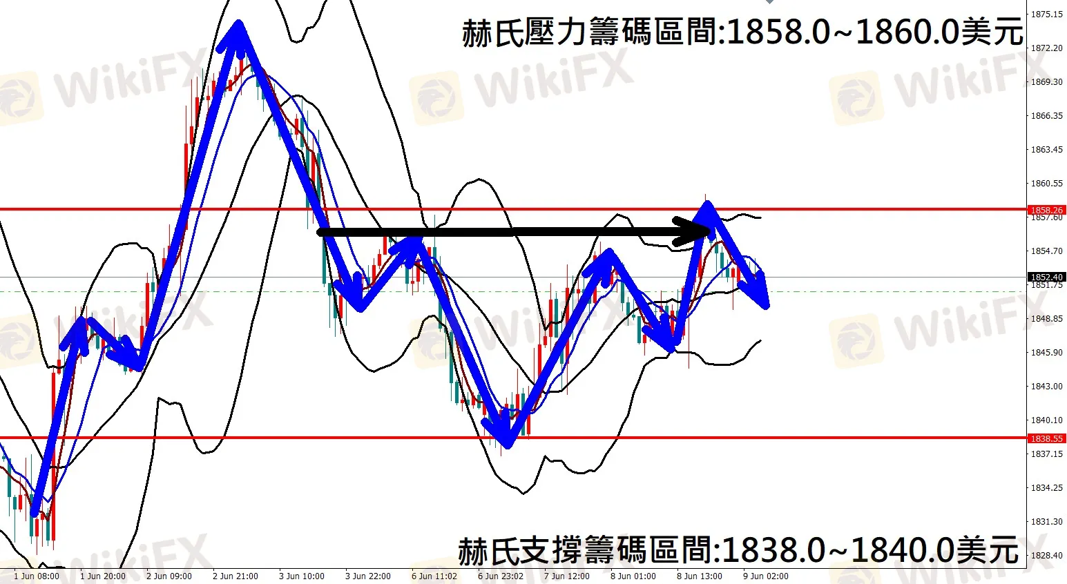 今日黃金(6月9日) 早盤在1851.9附近,從技術分析面切入,1小時級別觀察走勢架構昨日(8日)K棒出現反彈走勢,目前K棒拉回至上升趨勢線,有望跌破支撐後轉折下跌,因此建議佈局空單為主。