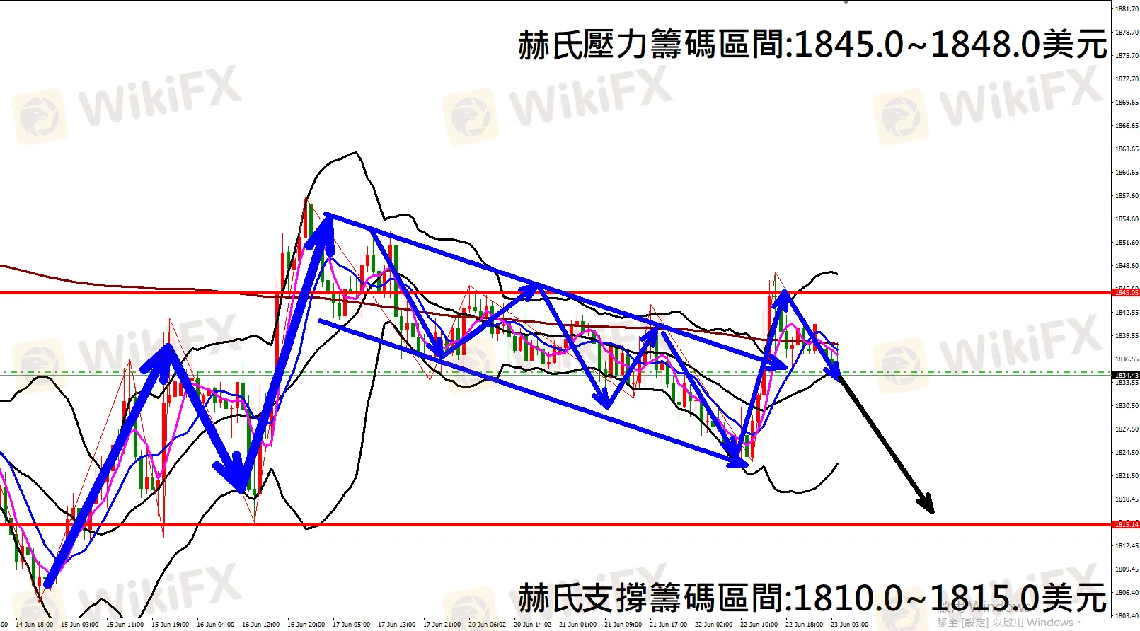 今日黃金(6月23日) 早盤在1837.4附近,從技術分析面切入,1小時級別觀察走勢架構符合昨日(22日)預測K棒盤中出現下跌走勢,空單獲利入袋,隨後再度反彈上漲,目前K棒震盪再拉回在布林通道中軌下軌,有望再度下跌,因此建議佈局空單為主。