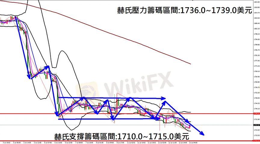 今日黃金(7月13日) 早盤在1724.9附近,從技術分析面切入,1小時級別觀察走勢架構昨日(12日)K棒持續狹幅震盪向下修正,目前K棒保持空方排列,若跌破支撐有望大幅下跌,因此建議佈局空單為主。
