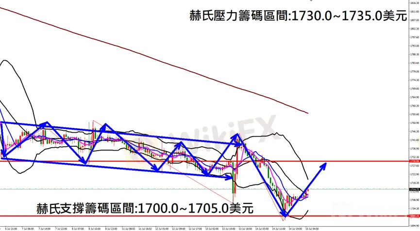 今日黃金(7月15日) 早盤在1709.8附近,從技術分析面切入,1小時級別觀察走勢架構符合昨日(14日)預測K棒盤中閃崩跌破1700大關,空單再次獲利入袋,隨後反彈吞沒跌幅,目前K棒低點震盪,有望持續小幅反彈,因此建議佈局多單為主。