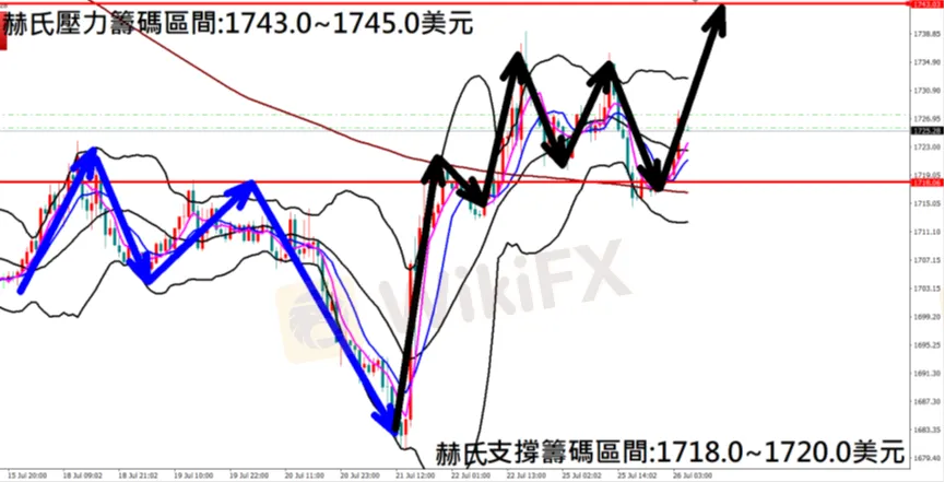 今日黃金(7月26日) 早盤在1717.7附近,從技術分析面切入,1小時級別觀察走勢架構昨日(25日)K棒出現拉回修正走勢,隨後觸及240MA赫赫線反彈,目前K棒偏向多方排列,有望拉回後再次反彈上漲,因此建議佈局多單為主。