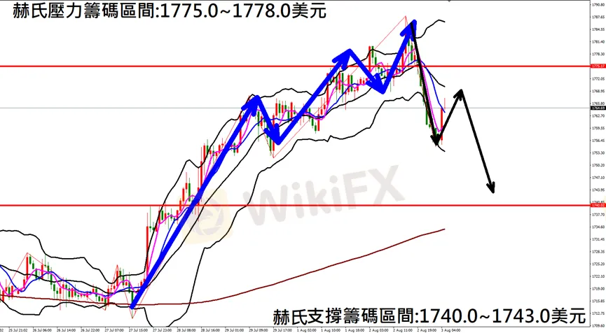 今日黃金(8月3日) 早盤在1760.3附近,從技術分析面切入,1小時級別觀察走勢架構符合昨日(2日)預測K棒持續上漲走勢,多單再度獲利入袋,隨後出現重挫走勢,目前K棒反彈上漲,若是中軌站不上將視為弱勢反彈,因此建議佈局空單為主。