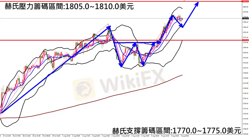 今日黃金(8月5日) 早盤在1790.6附近,從技術分析面切入,1小時級別觀察走勢架構昨日(4日)K棒持續上漲並保持多方排列,目前K棒落在布林通道中軌上方,同時開口持續朝上擴張,因此建議佈局多單為主。