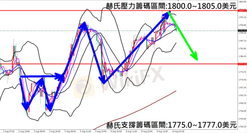 今日黃金(8月10日) 早盤在1793.9附近,從技術分析面切入,1小時級別觀察走勢架構昨日(9日)K棒持續上漲挑戰波段高點,隨後狹幅震盪,目前K棒落在布林通道中軌附近,同時開口有轉折朝下跡象,因此建議佈局空單為主。