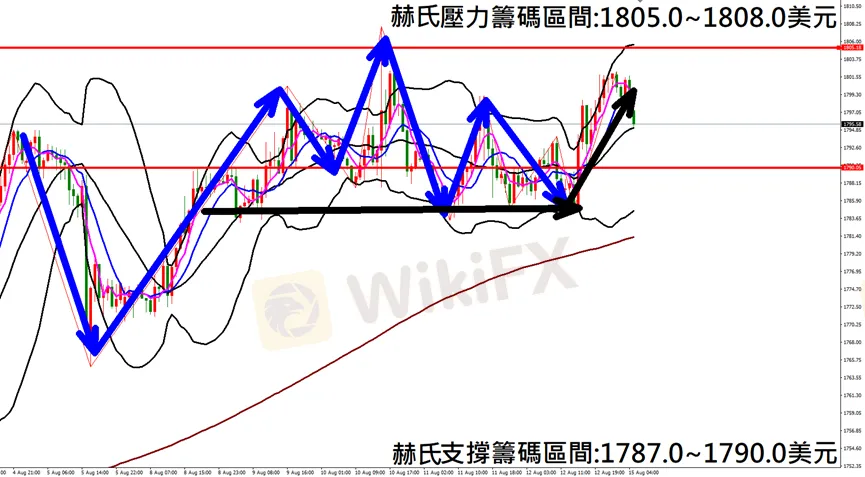 今日黃金(8月15日) 早盤在1801.8附近,從技術分析面切入,1小時級別觀察走勢架構上周五(12日)K棒持續上漲後再度拉回,目前K棒落在布林通道中軌附近震盪,若是開口出現轉折朝下跡象,有望挑戰240赫赫線支撐,因此建議佈局空單為主。