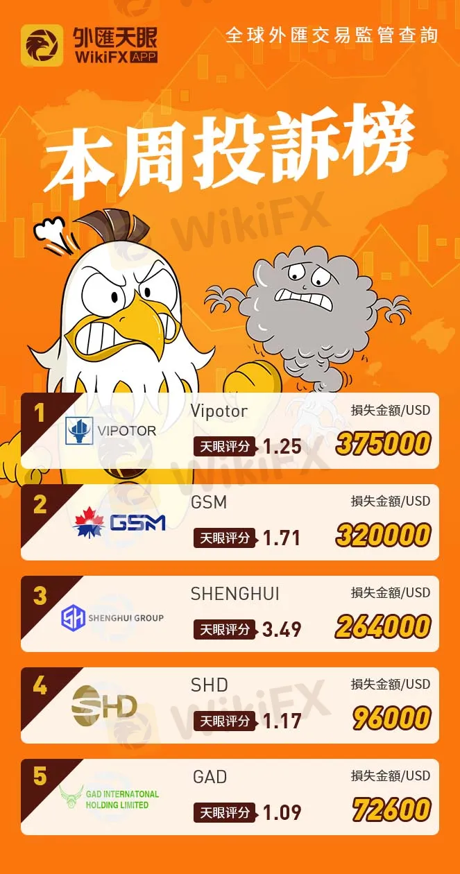 GAD與SHD一樣,在本週首次進榜。目前有2位受害者向外匯天眼爆料,其中一位是台灣投資人,他入金74,000元到該平台,之後想要出金,卻被告知需要達到某個交易額才行。當他好不容易完成要求後,客服依然拒絕出金,甚至不再回應,如今他的錢仍卡在裡面領不出來。