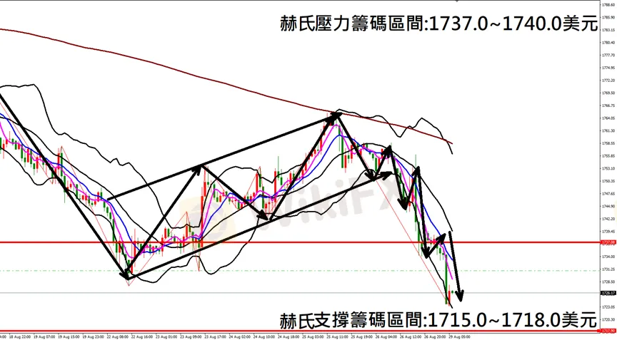 今日黃金(8月29日) 早盤在1736.8附近,從技術分析面切入,1小時級別觀察走勢架構符合上週五(26日)預測K棒反彈遇壓後出現暴跌重挫行情,空單獲利入袋,目前K棒仍呈現空方排列,同時布林通道開口朝下擴張,因此建議佈局空單為主。